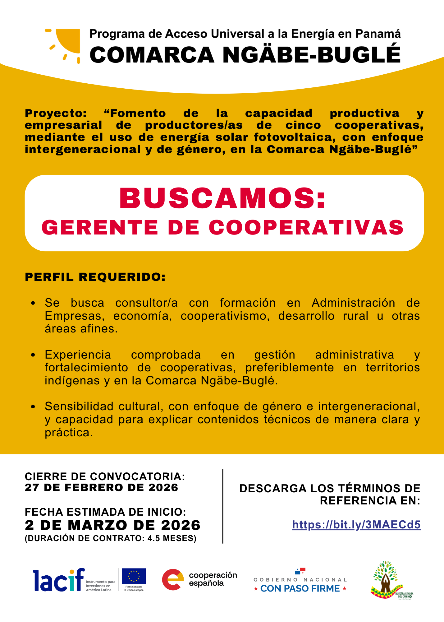 Título del anuncio: Consultor/a para asistencia técnica como Gerente para el acompañamiento administrativo y operativo de Cooperativas de la Comarca Ngäbe-Buglé (Programa de Acceso Universal a la Energía).