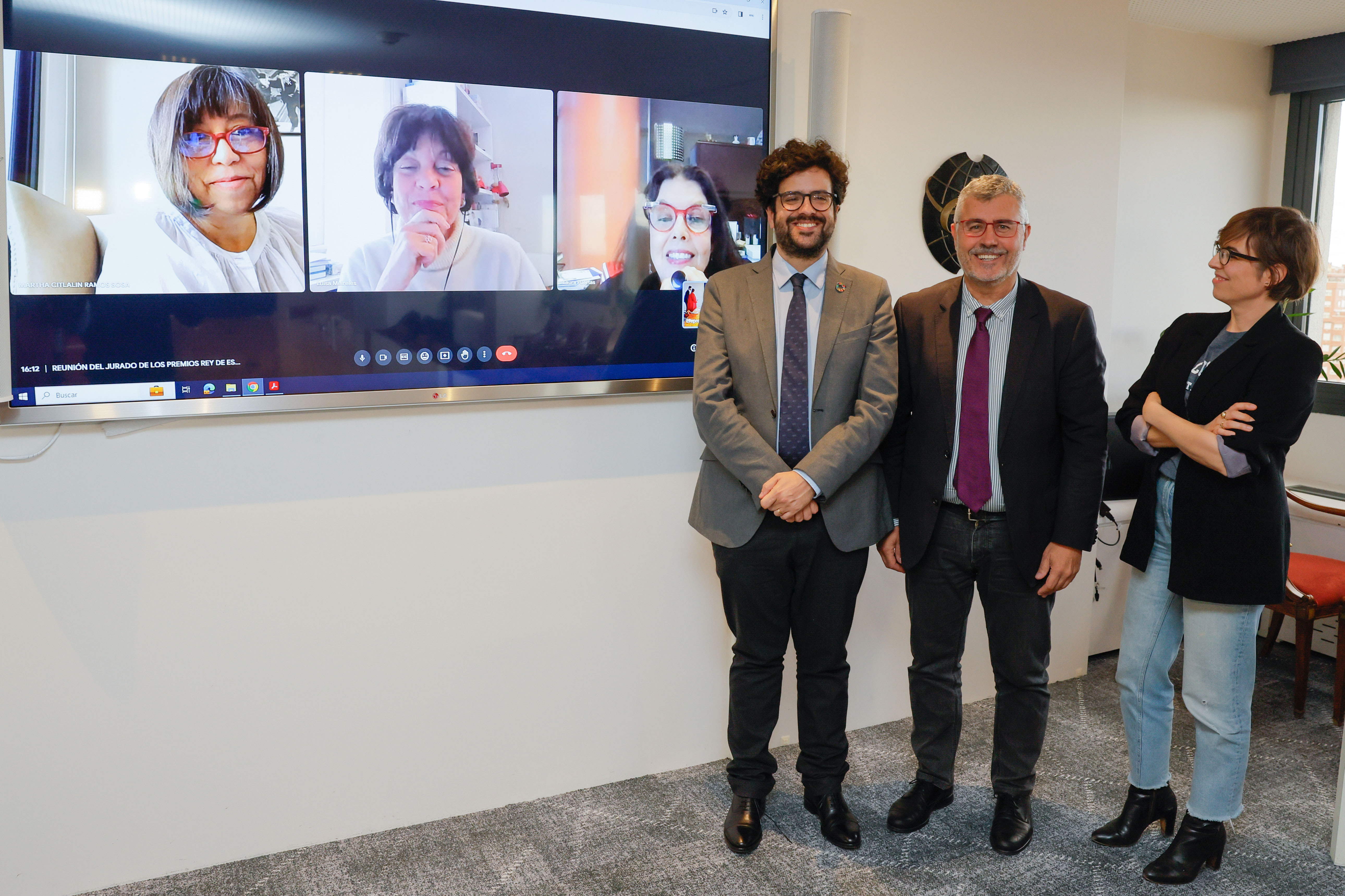 El presidente del jurado y director de AECID, Antón Leis; el presidente del agencia EFE, Miguel Ángel Oliver; y la jefa de comunicación y prensa del Instituto Cervantes y vocal del jurado, Sonia Pérez Marco